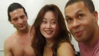 Hot dark haired sweetie gives an outstanding deep throat to an Asian dude before getting down and messy